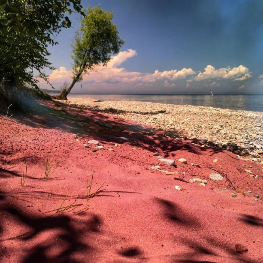 Гранатовый пляж находится на южном побережье Байкала, рядом с городом Байкальск. Свое название он получил из-за необычного песка, который здесь имеет насыщенный бордовый оттенок. Такой цвет пляжу дают частицы яркого камня – граната. Благодаря оригинальному оттенку песка он хорошо получается на фотографиях, особенно красивые кадры можно сделать на закате.