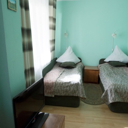В номере: две односпальные кровати, прикроватные тумбочки, гардероб, вешалка, центральное отопление, телевизор, холодильник, балкон, красивый вид. В ванной: туалет, раковина, душ, средства личной гигиены, зеркало, набор полотенец.Оплата за птание ребенка от 1,5 до 3 лет - 900 руб. в сутки.